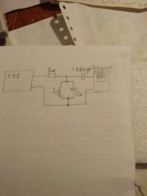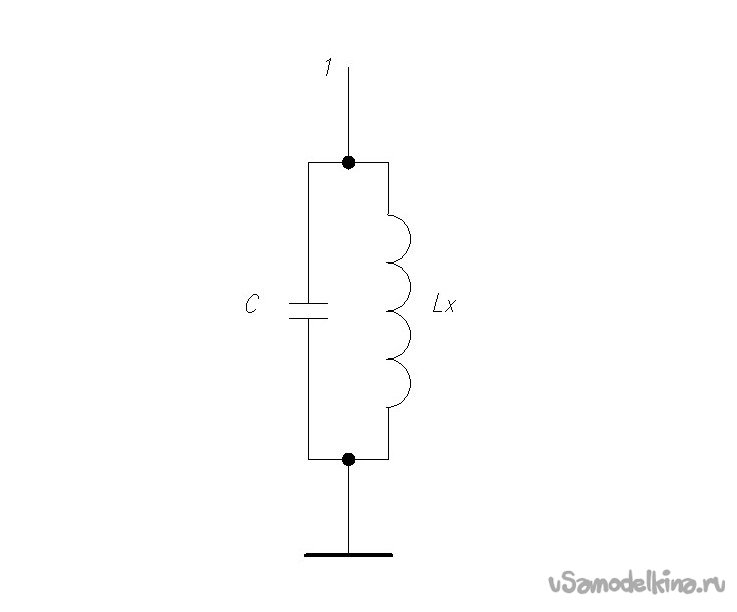 Рис. 3. Из исследуемой катушки и образцового конденсатора собираем параллельный колебательный контур. Применил старый керамический конденсатор на 92 пФ. В точку 1 подаем прямоугольный сигнал частотой в несколько кГц, амплитудой в пару вольт. Удобно с генератора, но можно воспользоваться и сигналом калибратора осциллографа. Получившиеся ударные колебания подаем на вход осциллографа через конденсатор минимальной емкости и определяем их частоту.