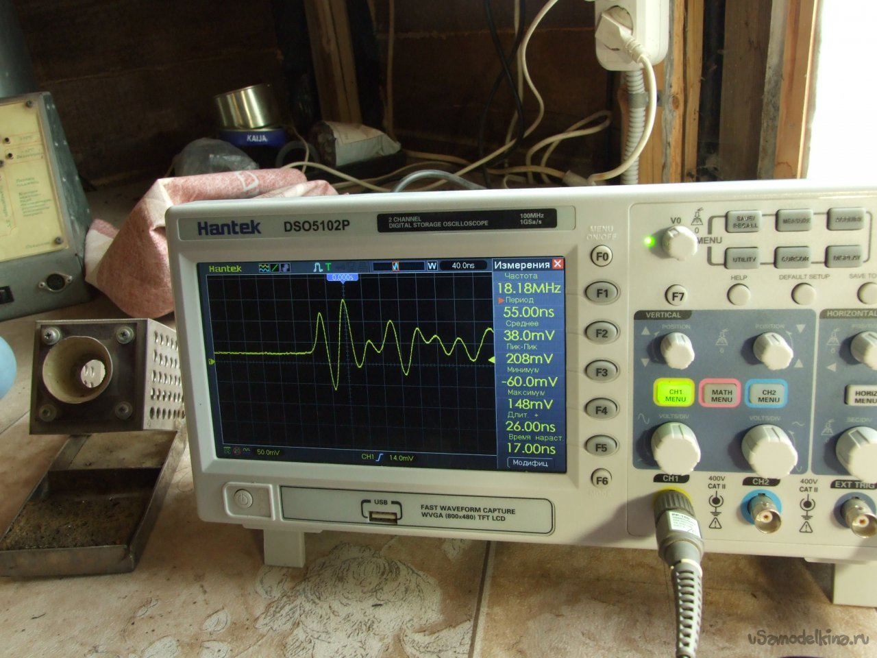 Фото 5. Развернув пошире один из всплесков и удержав его на экране получил фото затухающего импульса, тут же нарисовалась и его частота.