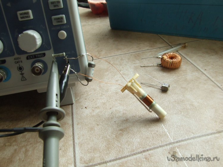 Фото 4. Контур подключенный к непременному калибратору осциллографа, здесь это две никелированных ламели. Выводы элементов спаял, к калибратору прижал прищепками от самого измерительного кабеля. Конденсатор связи – в несколько пФ.