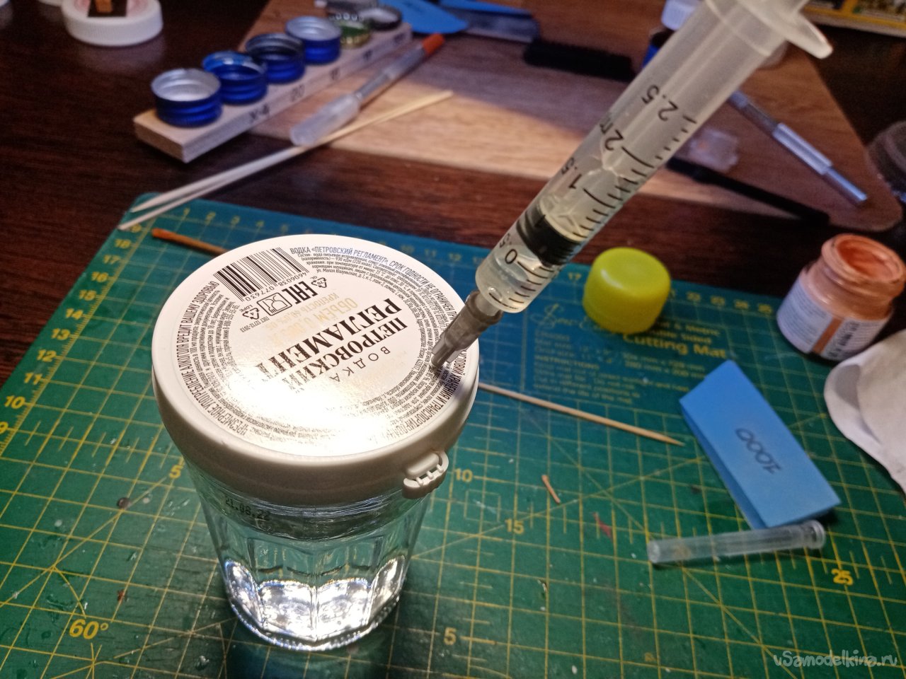 Краски разбавляю водкой. Купил небольшую чекушку с пластиковой крышкой. Проткнул иголкой со шприцом. Набираю нужное количество, не открывая крышки. Удобно.