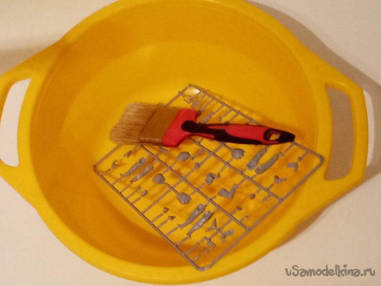 Для начала очень тщательно промываю в горячей воде с моющим средством. Нужно смыть грязь и смазку. Иначе трудно будет красить. Осторожно промываю литниковые рамки при помощи мягкого флейца. Внимательно смотрю, за мелкими деталями. Они очень легко отламываются и теряются.