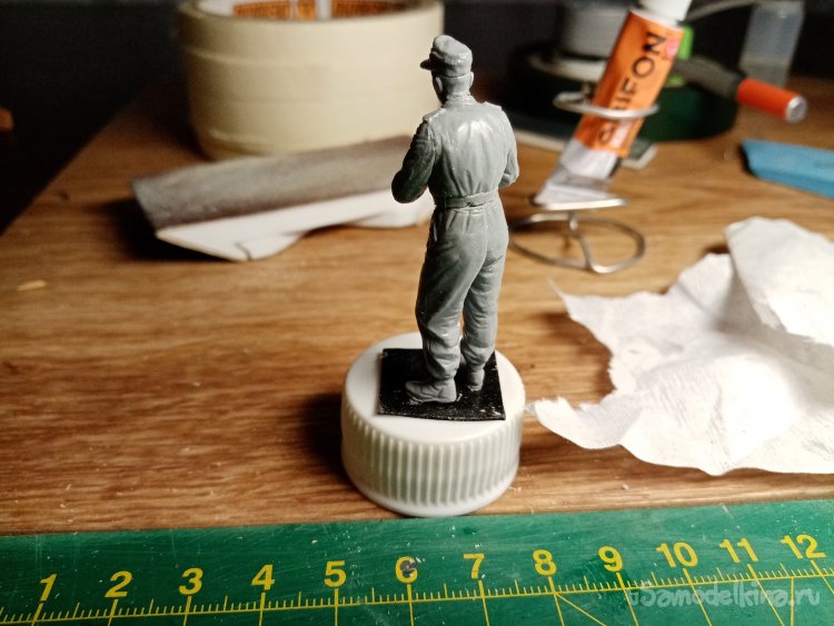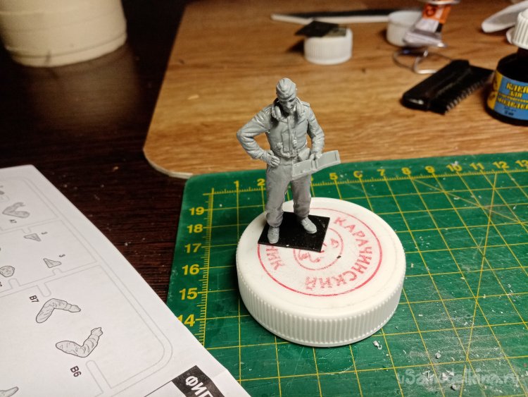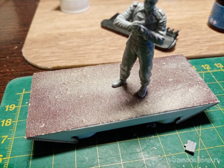 Собрался и склеился танкист на одном дыхании. Все части отлично подошли при монтаже. Облоя практически нет. Немного пошаркал ногами по шкурке. Для большей устойчивости.
