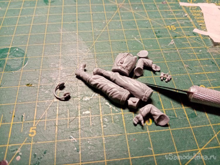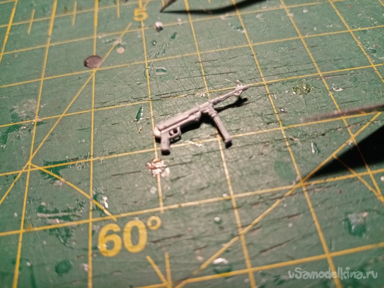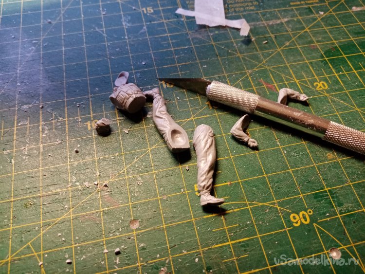 Начинаю сбору первого солдатика. Отрезаю от литников части корпуса. И оружие. Перерезаю перемычки подальше от элементов. Иначе можно подломать оригинал. После подрезаю до чистоты.