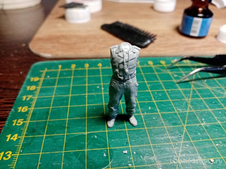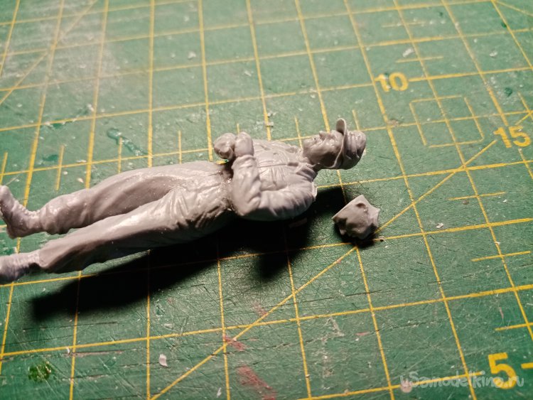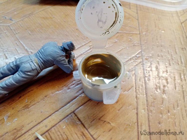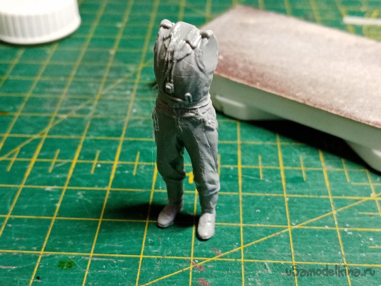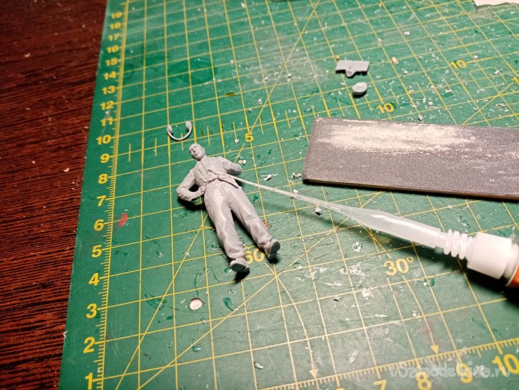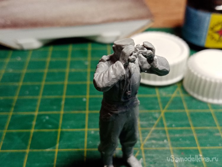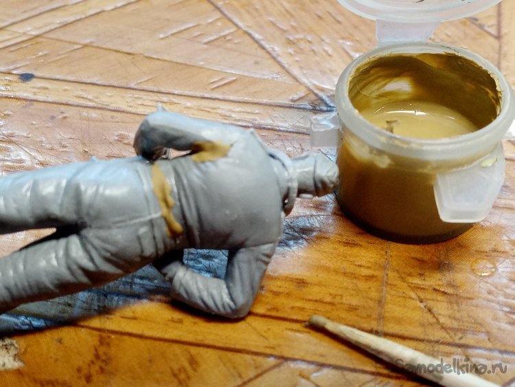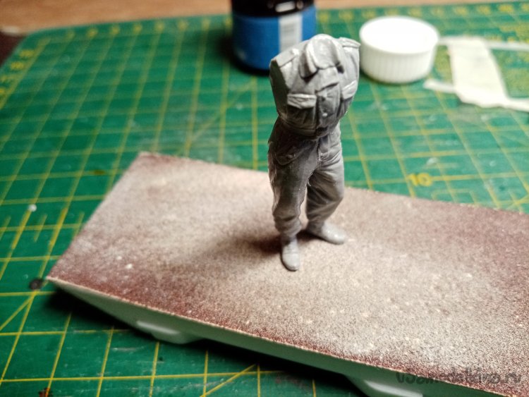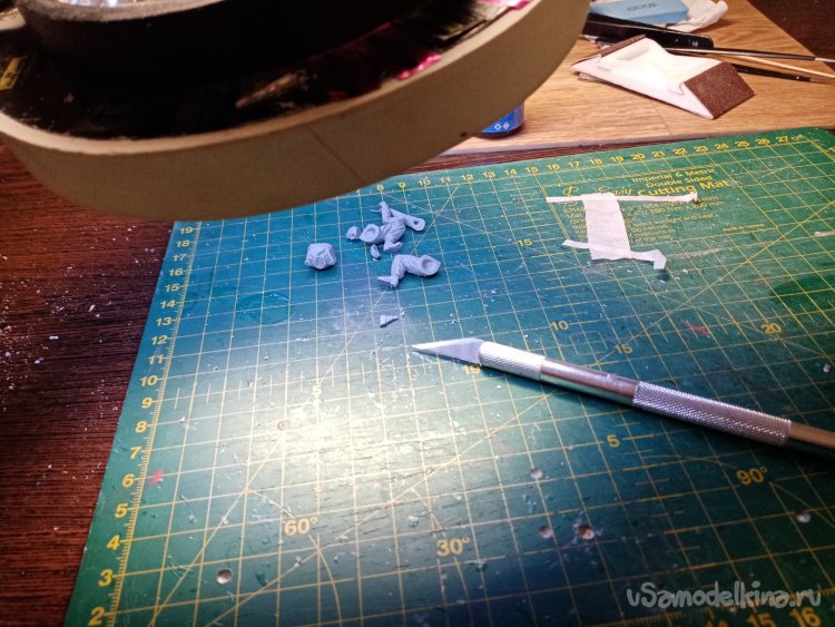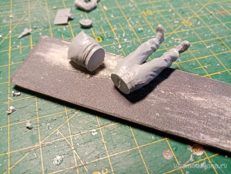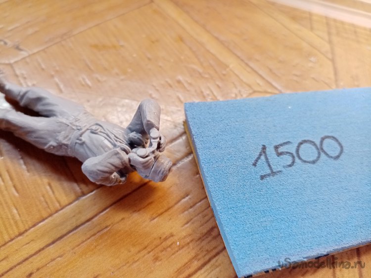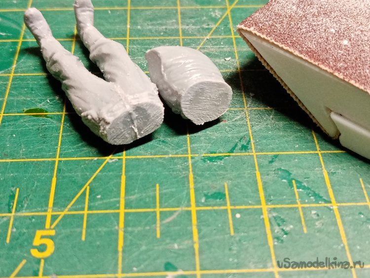 Развел еще одну порцию шпаклевки при помощи более «медленного» растворителя 450го. С им получается наносить шпателем. Заделываю небольшие щели на фигурках. Через час можно уже и шкуркой пройтись.