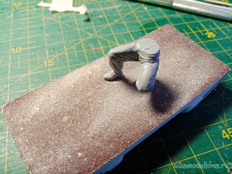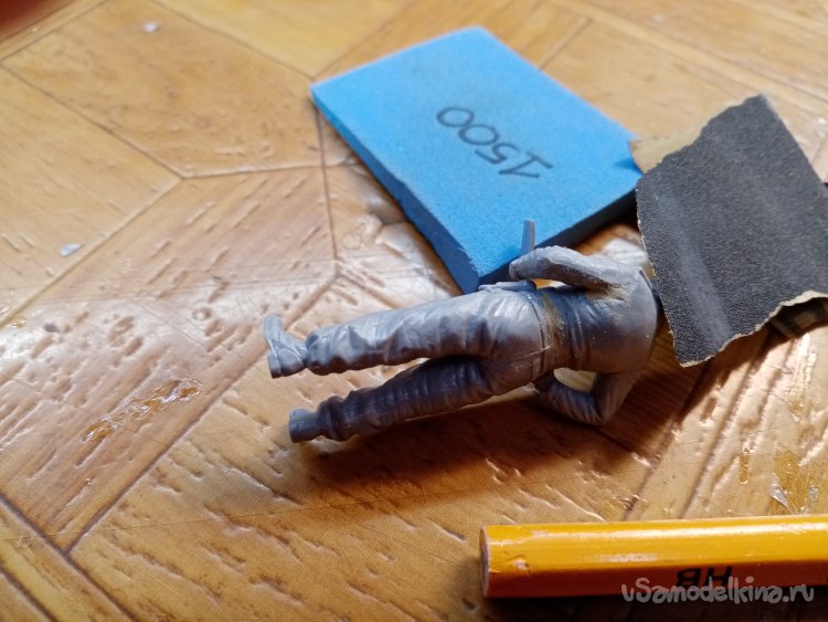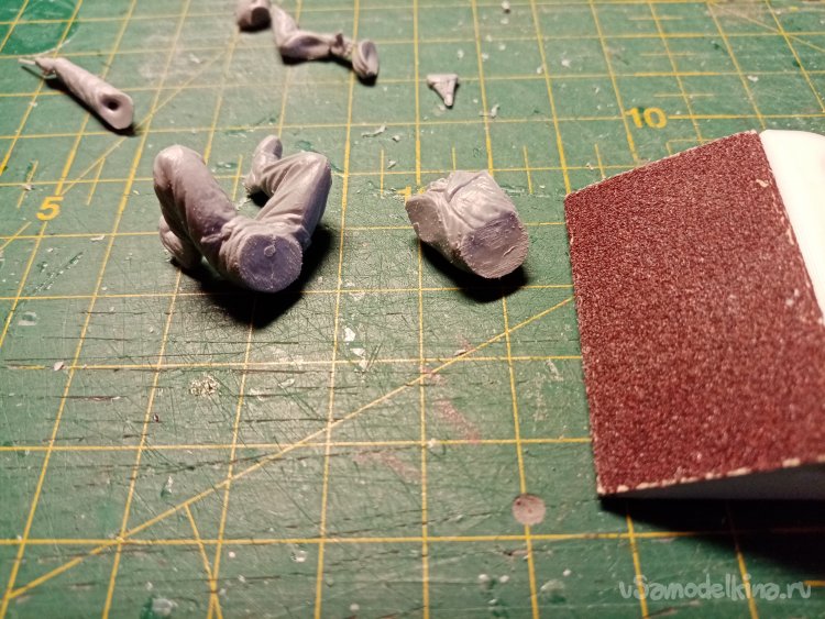 Сборку освещу более подробно. Зачищаю место соединения штанов с торсом на крупной шкурке. В процессе на пластике образуются небольшие лохматушки. При нанесении клея они плавятся и заполняют некоторые маленькие неровности.