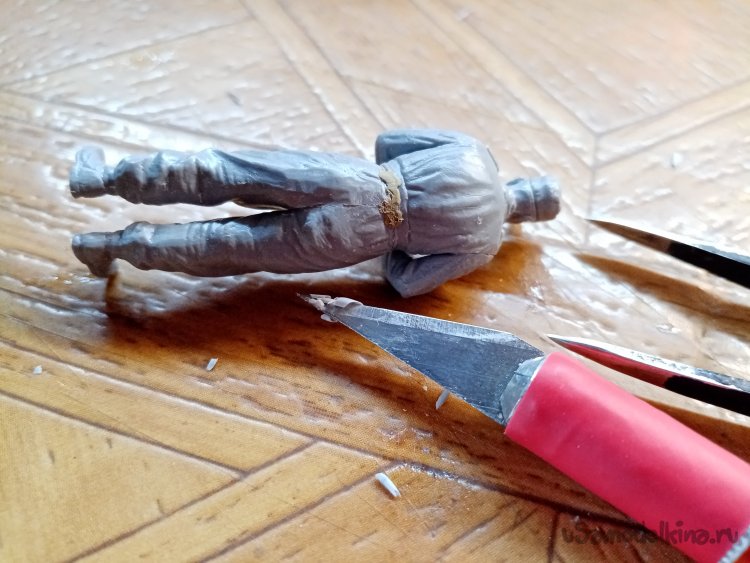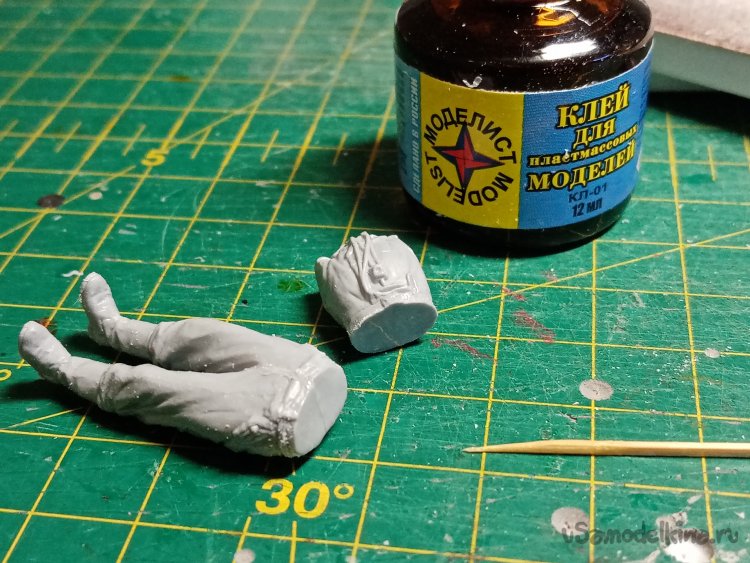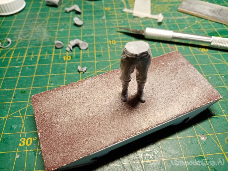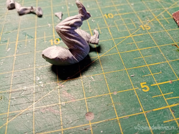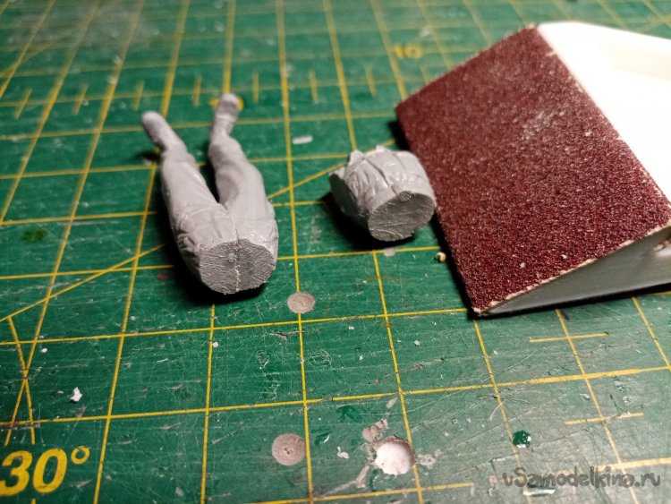 Склеил основные элементы фигурки. На плоской поверхности шкурки подгоняю подошвы для лучшей устойчивости.