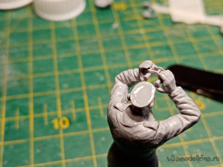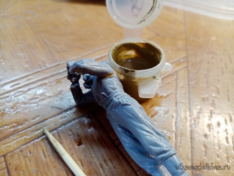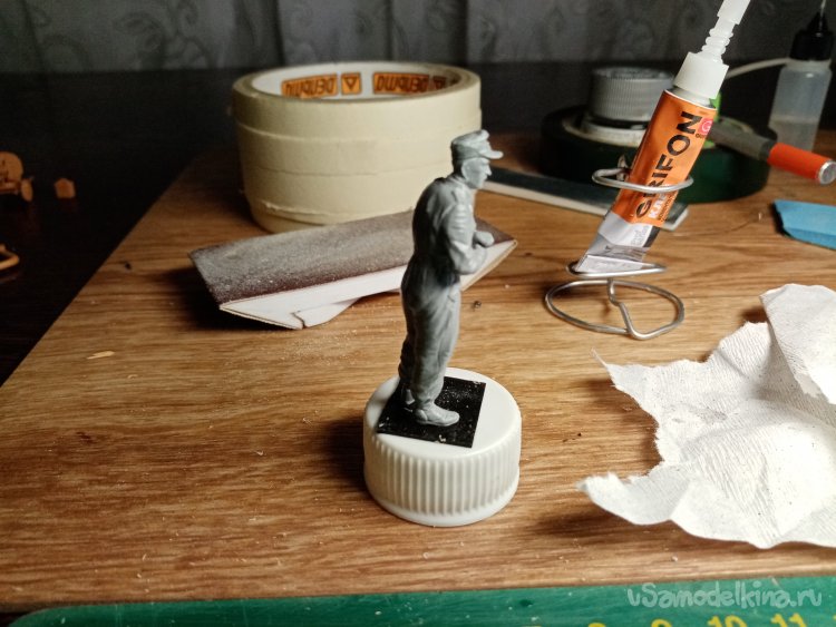 Затем нужно установить фигурку на более прочное основание. Устойчивость повышается и удобно брать при работе. Вообще нужно как можно меньше касаться пластика руками. При необходимости чаще мыть руки. Или работать в перчатках.