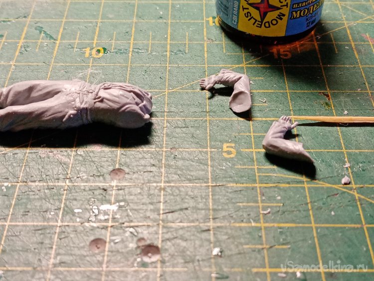 Правая рука не менее трудна. Она должна дотянуться палочкой до земли. В некоторых случаях сложного положения тела нужно применять именно клей для пластика. Наношу побольше. Чтобы места соединения начали плавиться, иногда перемещаю немного элементы относительно друг друга. Чтобы соединение сплавилось. Кое где получается небольшой валик пластика по шву. Это не страшно. Потом срежу. Такой прием позволяет соединять элементы практически без щелей. Расплавленный пластик не встает достаточно долго и можно подвигать руками. Ногами, головой добиваясь нужной позы. Но есть момент. Приходится весьма продолжительное время ждать отверждения клея. Постоянно поправляю позу.