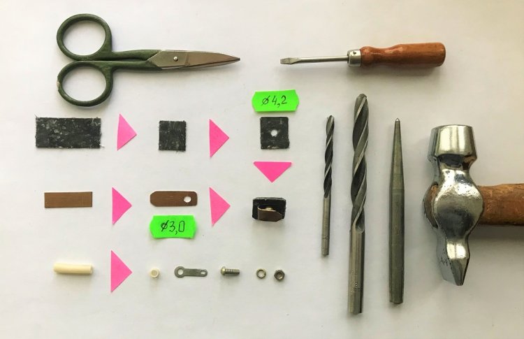 1). Вырезание ножницами из листового паронита 3 изолирующих прокладок с отверстием D=4,2 мм. Быстрее будет если сначала просверлить отверстия, а уже затем разрезать заготовку.