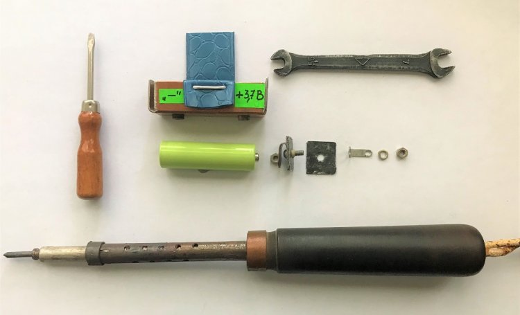 Порядок сборки подпружиненного контакта «+3,7 В» для аккумуляторного отсека. Торцы отсека лудятся паяльником мощностью не менее 60 Вт.