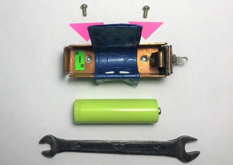Отсек для аккумулятора типоразмера AA-size в сборе. Боковые кромки сторон отсека облужены, на случай дальнейшего укрепления жёсткости корпуса (Пропаивать лужёные части, как оказалось после пробной установки GB1 и отсек, не потребовалось).