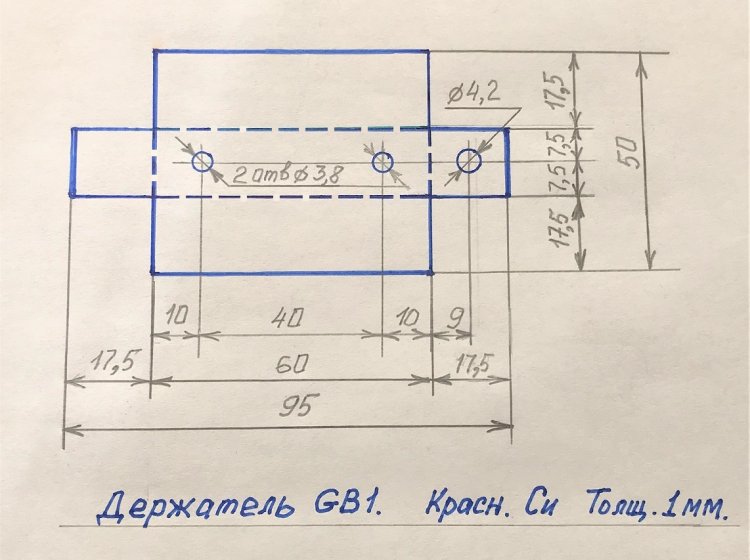 Развёртка отсека – держателя GB1 из листовой красной меди толщиной 1 мм. Пунктиром указаны линии изгиба развёртки под углом 90 градусов.