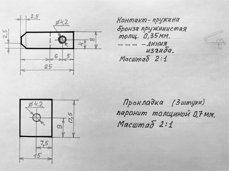 Чертежи развёрток контакт-пружины (подпружиненного контакта «+3,7 В») и трёх паронитовых прокладок. Контакт-пружина вырезается ножницами по металлу и её кромки обрабатываются надфилем или плоским бархатным напильником