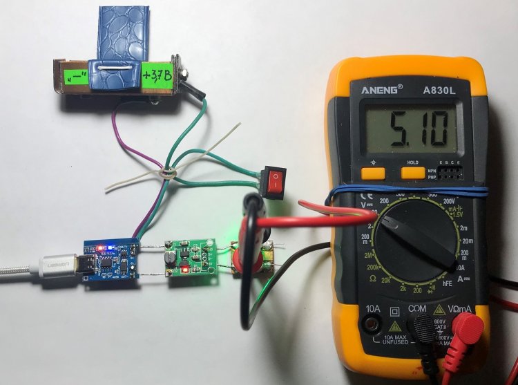 Подключённые к источнику +5 Вольт модуль А1 + модуль А2 (без подключённого аккумулятора GB1) вырабатывают выходное напряжение +5,10 Вольта. Но не всё так просто! (Больше информации смотрите в видео).