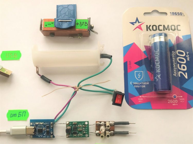 Крупногабаритный аккумулятор «Космос» 18650 производства КНР, имеющий почему-то одинаковое обозначение с аккумулятором 18650 типоразмера AA-size, также можно использовать в предлагаемом вашему вниманию аккумуляторном блоке питания (несмотря на то, что аккумулятор - «гигант» имеет встроенную защитную плату).