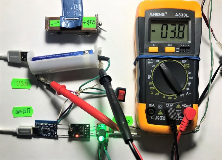 На свежем аккумуляторе, отдающем в нагрузку небольшой (90 мА) ток через модуль А2 (DC/DC преобразователь до +5 Вольт), контролируется постоянное напряжение 3,8 Вольта (замерено сразу после вынимания аккумулятора из упаковки).