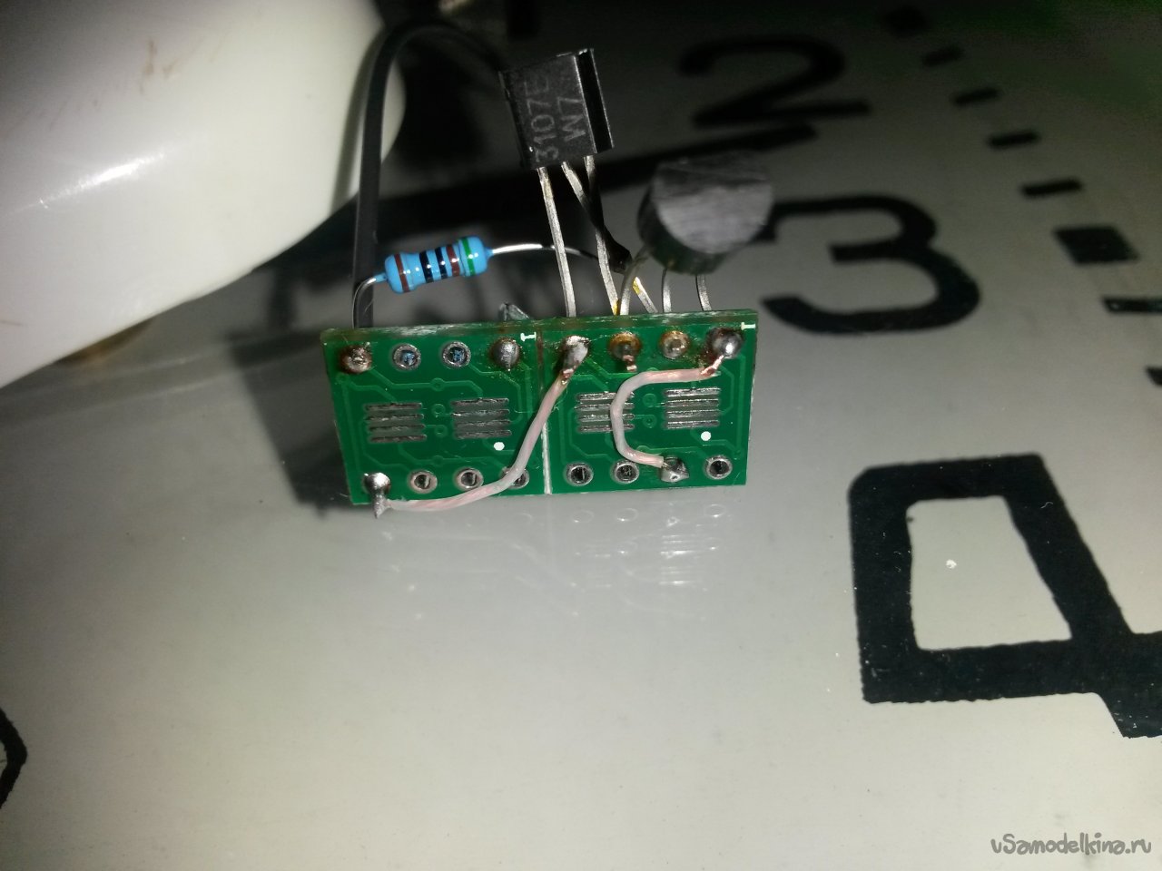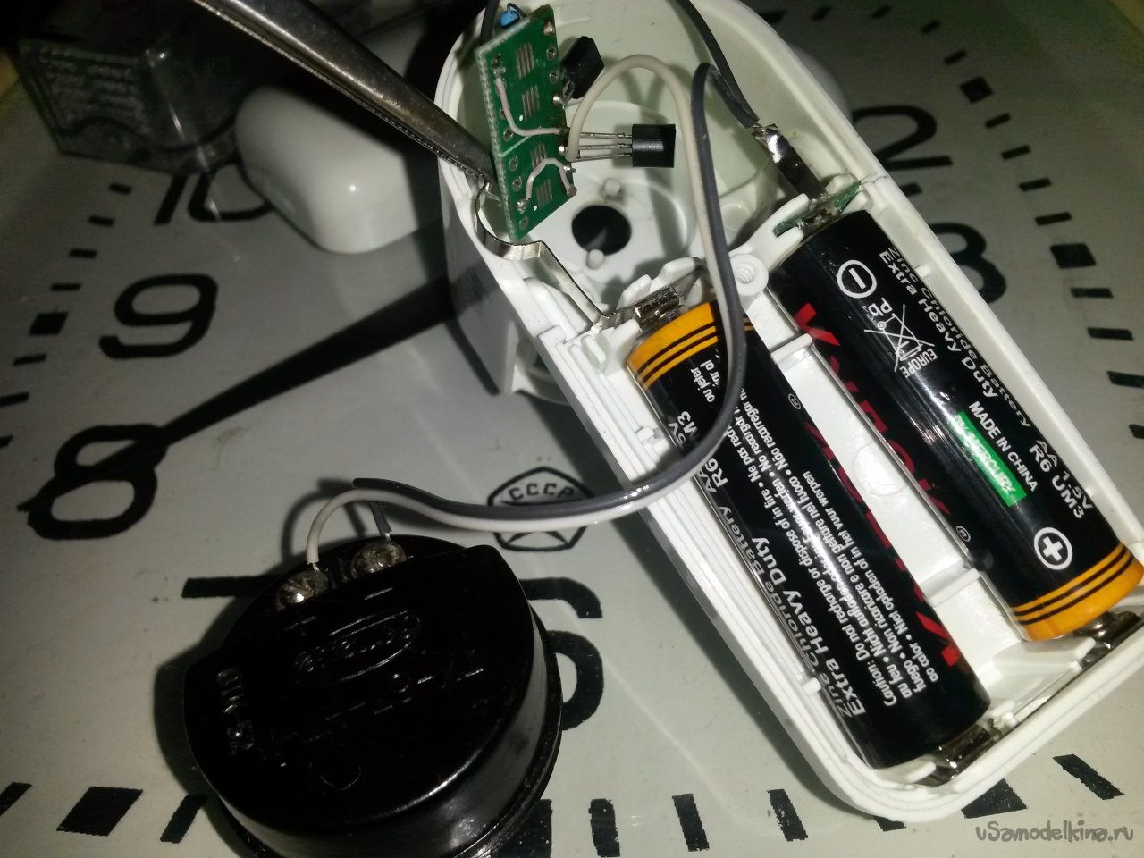 Подсоединяем излучатель, припаиваем минус питания и можно проверить работу устройства.