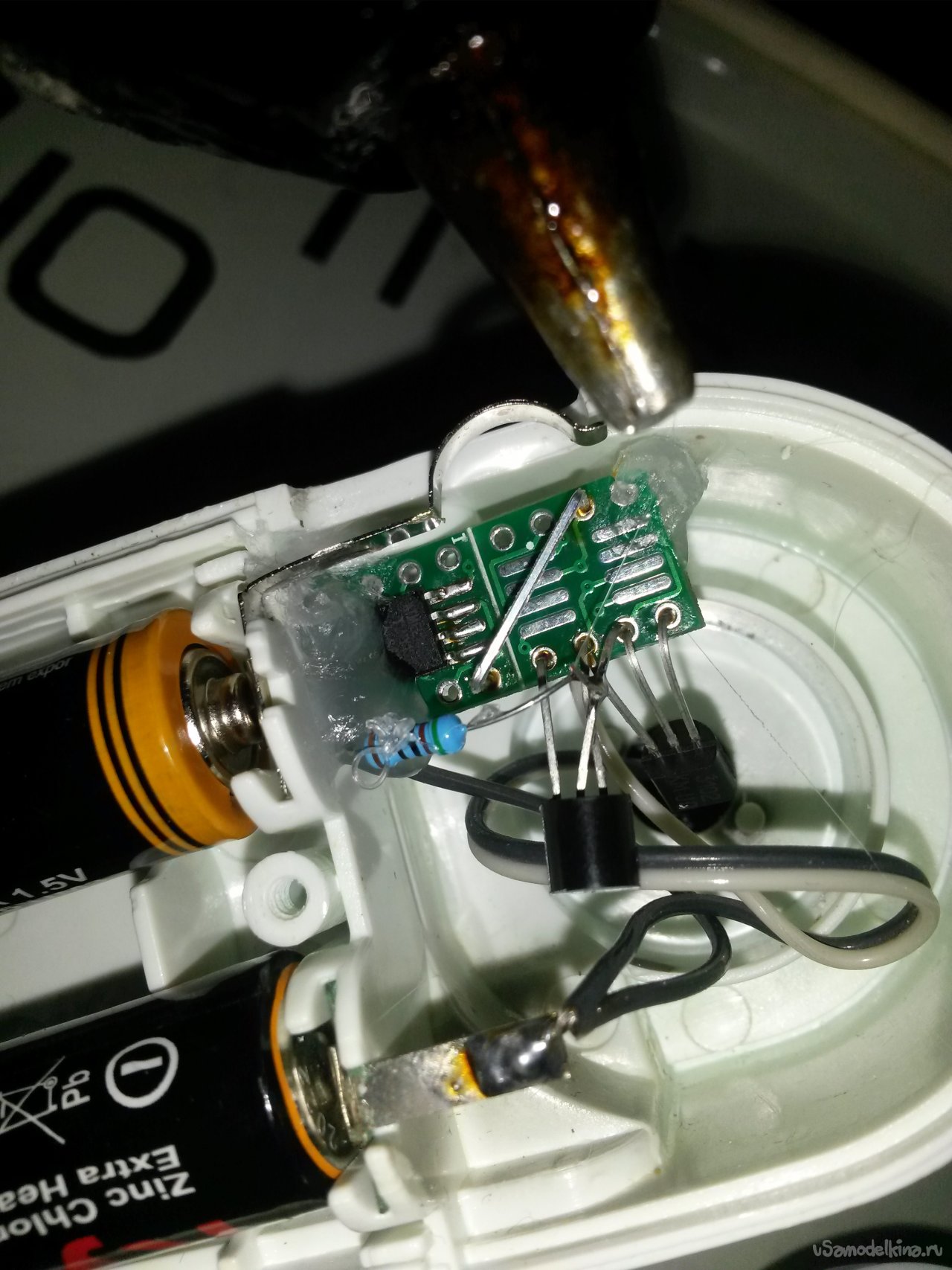 Ну и самая ответственная часть сборки: Необходимо подклеит плату к корпусу термопистолетом так, что бы скоба касалась подвижного контакта выключателя в положении "вкл".