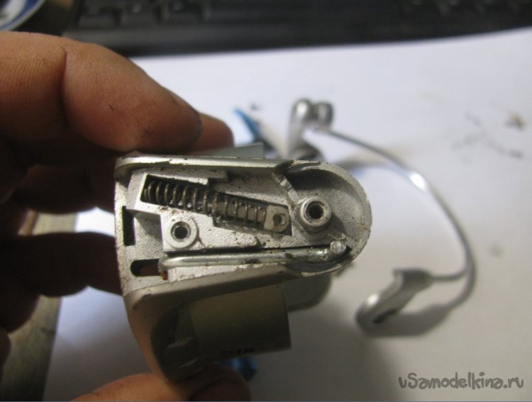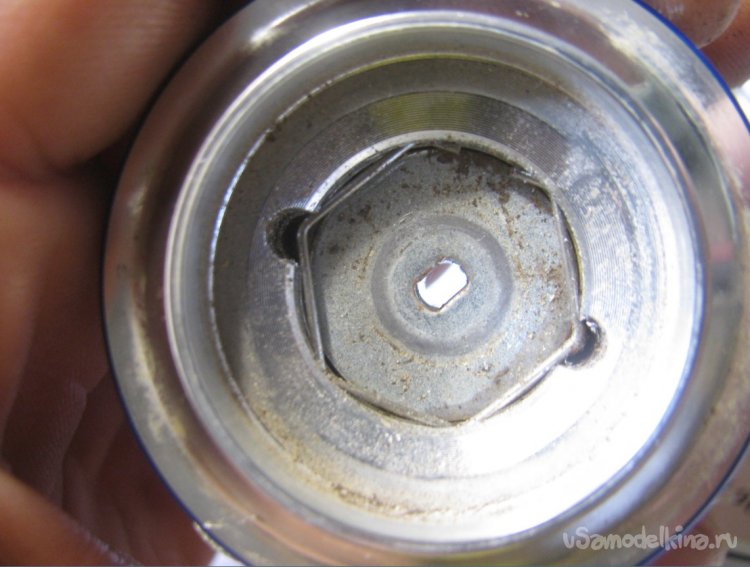 Для разборки нужно открутить 3 винта на крышке, один из них спрятан под крышкой, установленной на торце. Также откручиваем по часовой стрелке и снимаем носовую часть с дужкой.