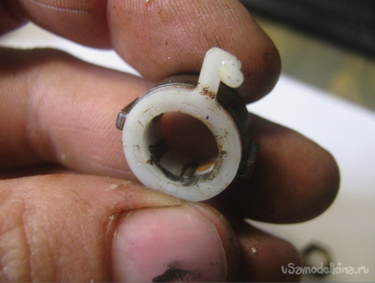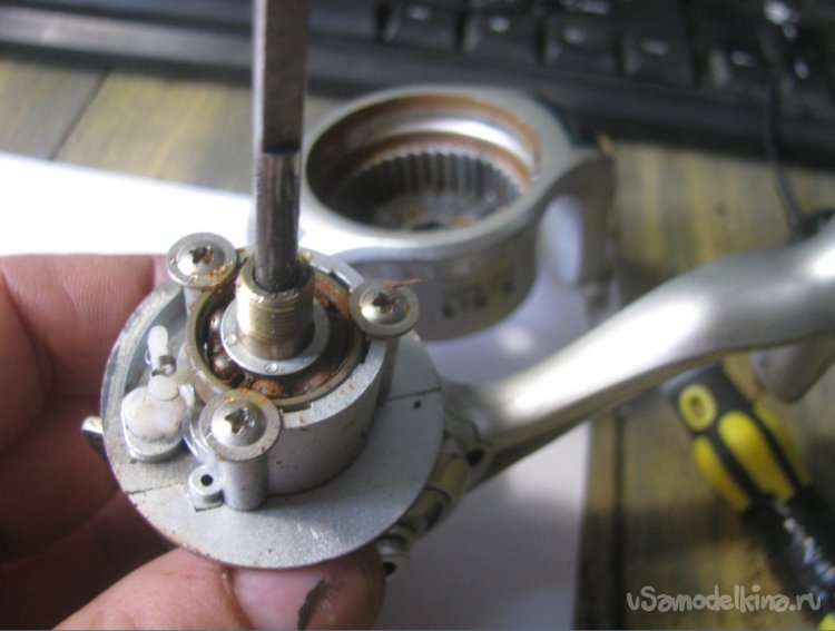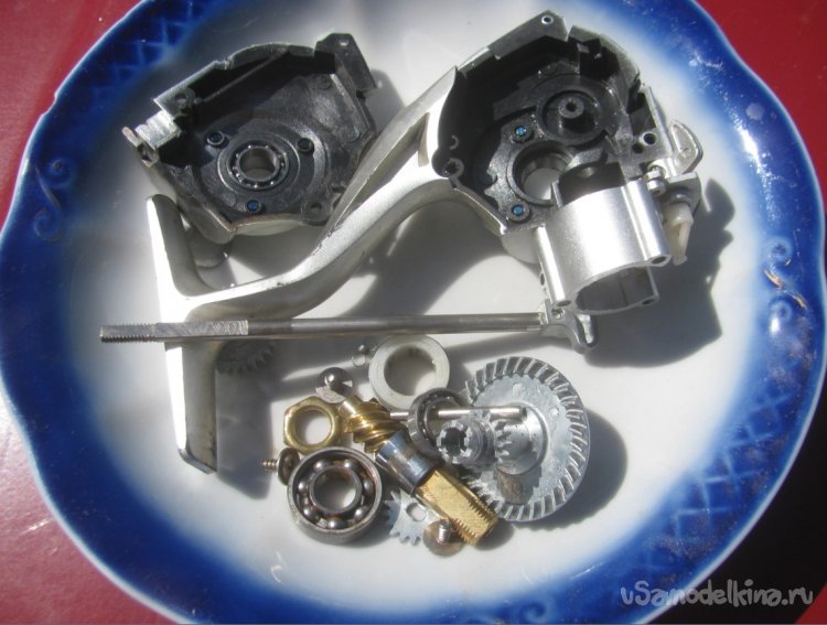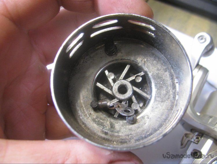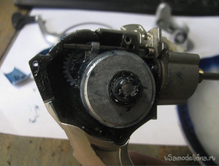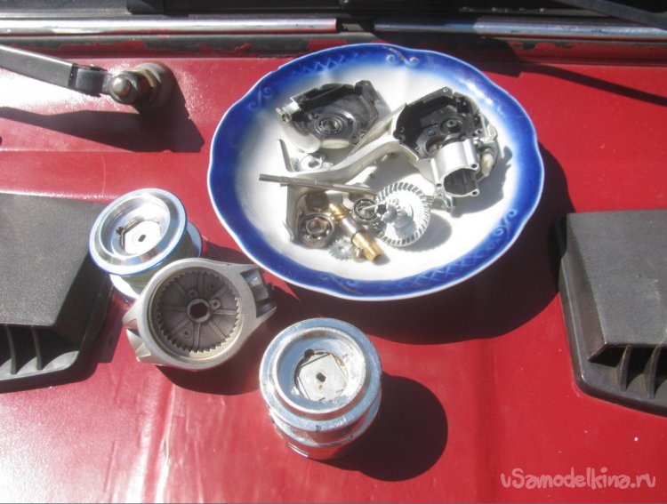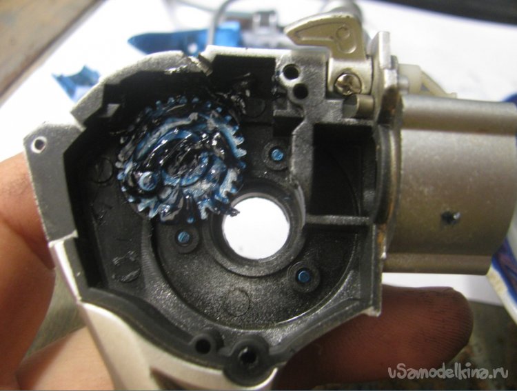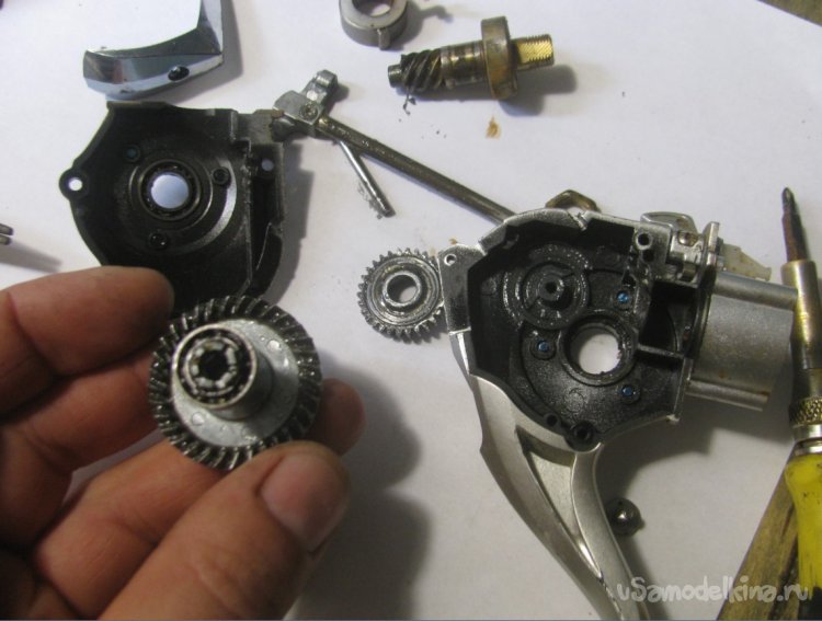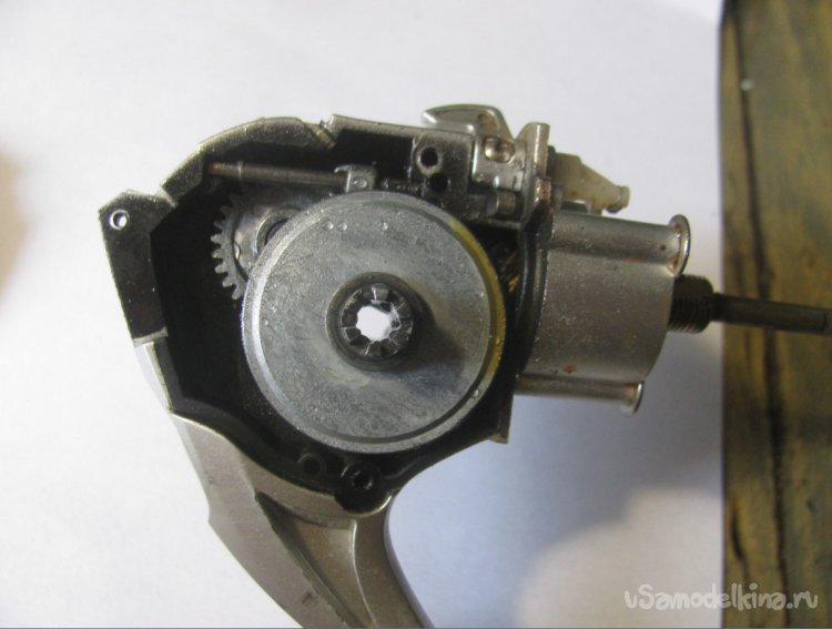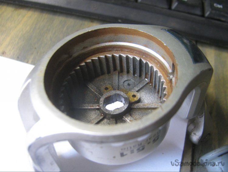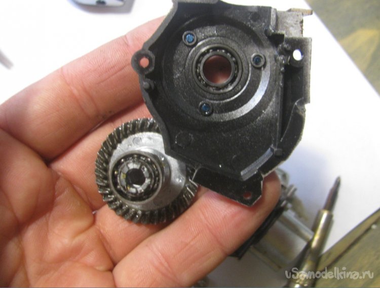 Большая ведущая шестерня сделана из алюминия, она вращается на двух подшипниках. Маленькая ведомая шестерня из латуни, она вращается на одном подшипнике (он у нас и заржавел).