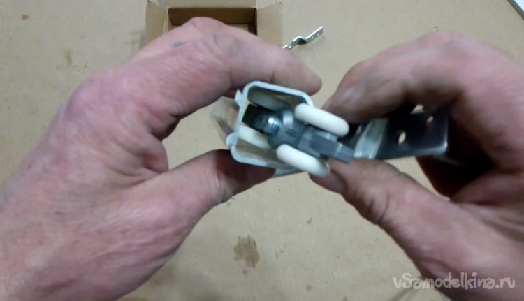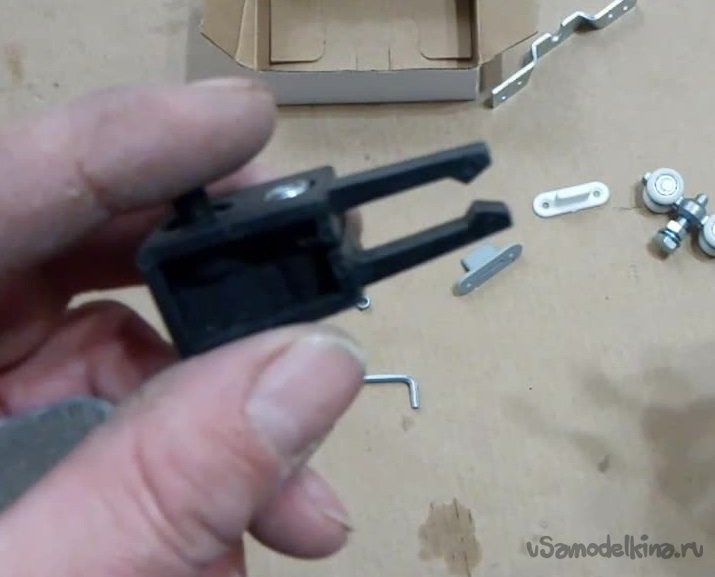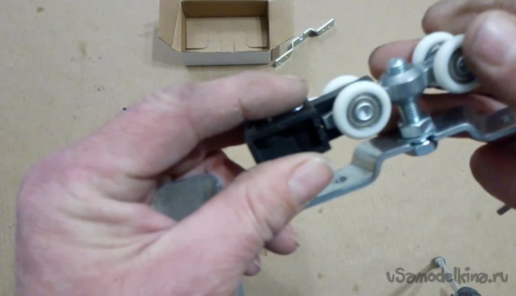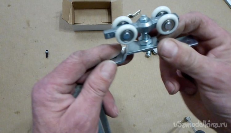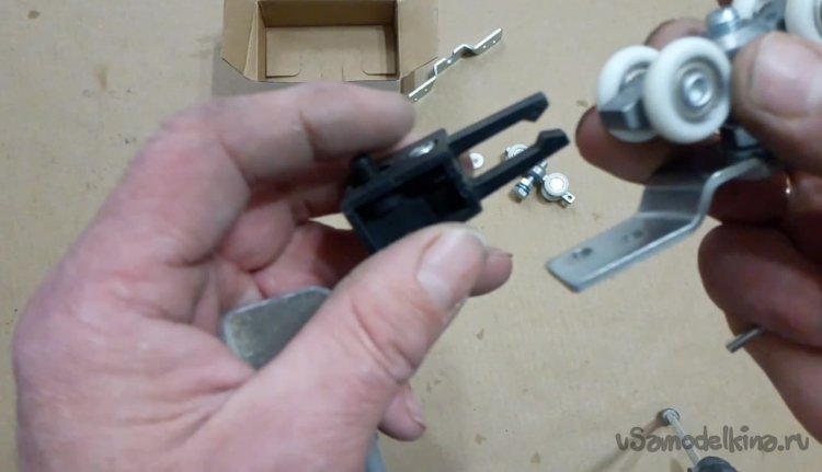 Каретки прикрепляются к верхнему торцу дверного полотна. Будучи вставленными в верхний рельс, позволяют перемещать висящую на них дверь: