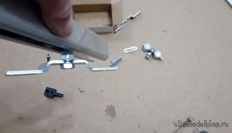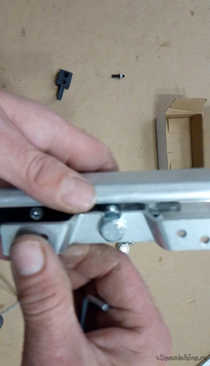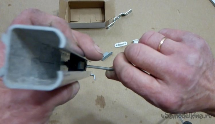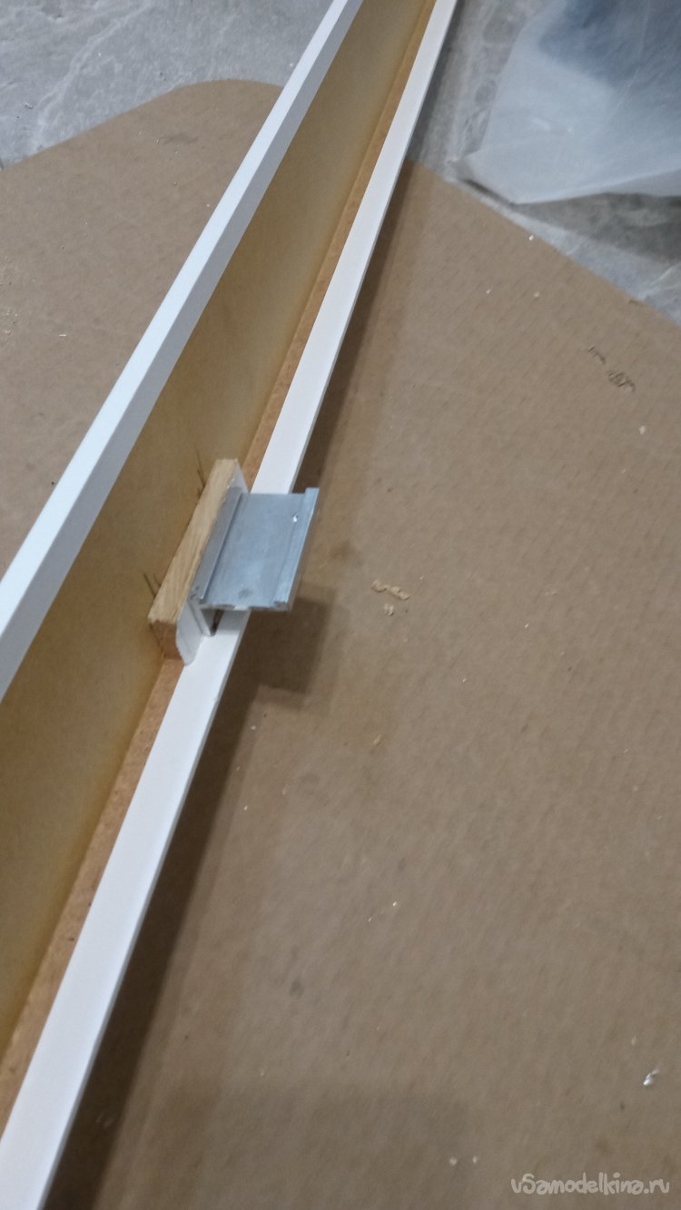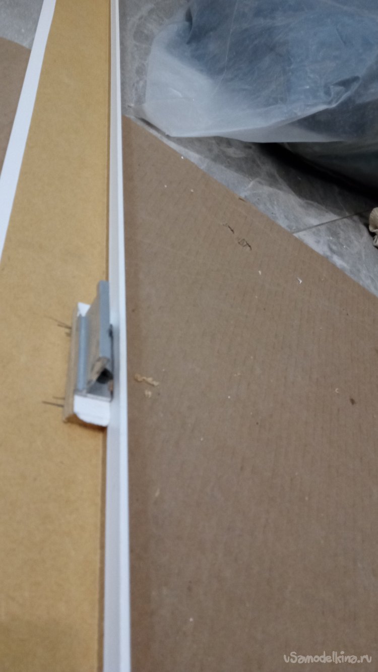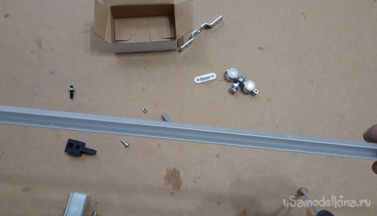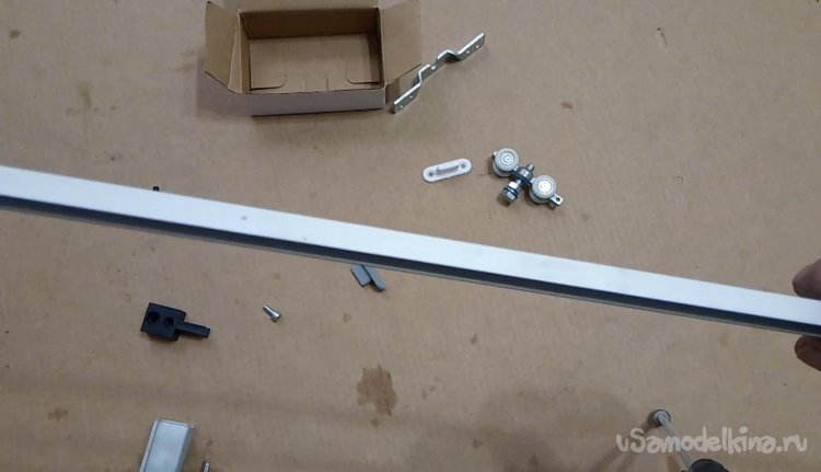 Рельс монтируется с каретками и ограничителями внутри. Полотно навешивается позже, за заранее прикреплённые к его торцу длинными шурупами кронштеёны: