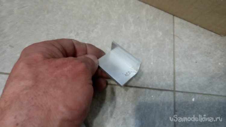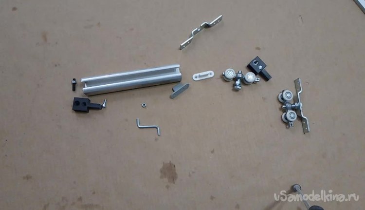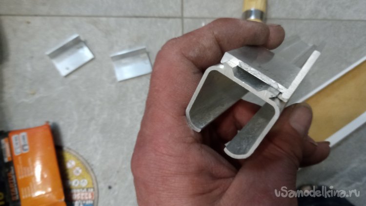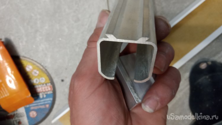 Верхний алюминиевый рельс я купил специализированый (на фото выше представлен его обрезок после подгонки размера. Рельс продаётся двухметровым). А в качестве нижнего рельса купил алюминиевый швелер, сечением 8Х8 мм в строительном супермаркете. Суть одно и то-же! Но, если он продаётся не как часть механизма, он стоит намного дешевле))))