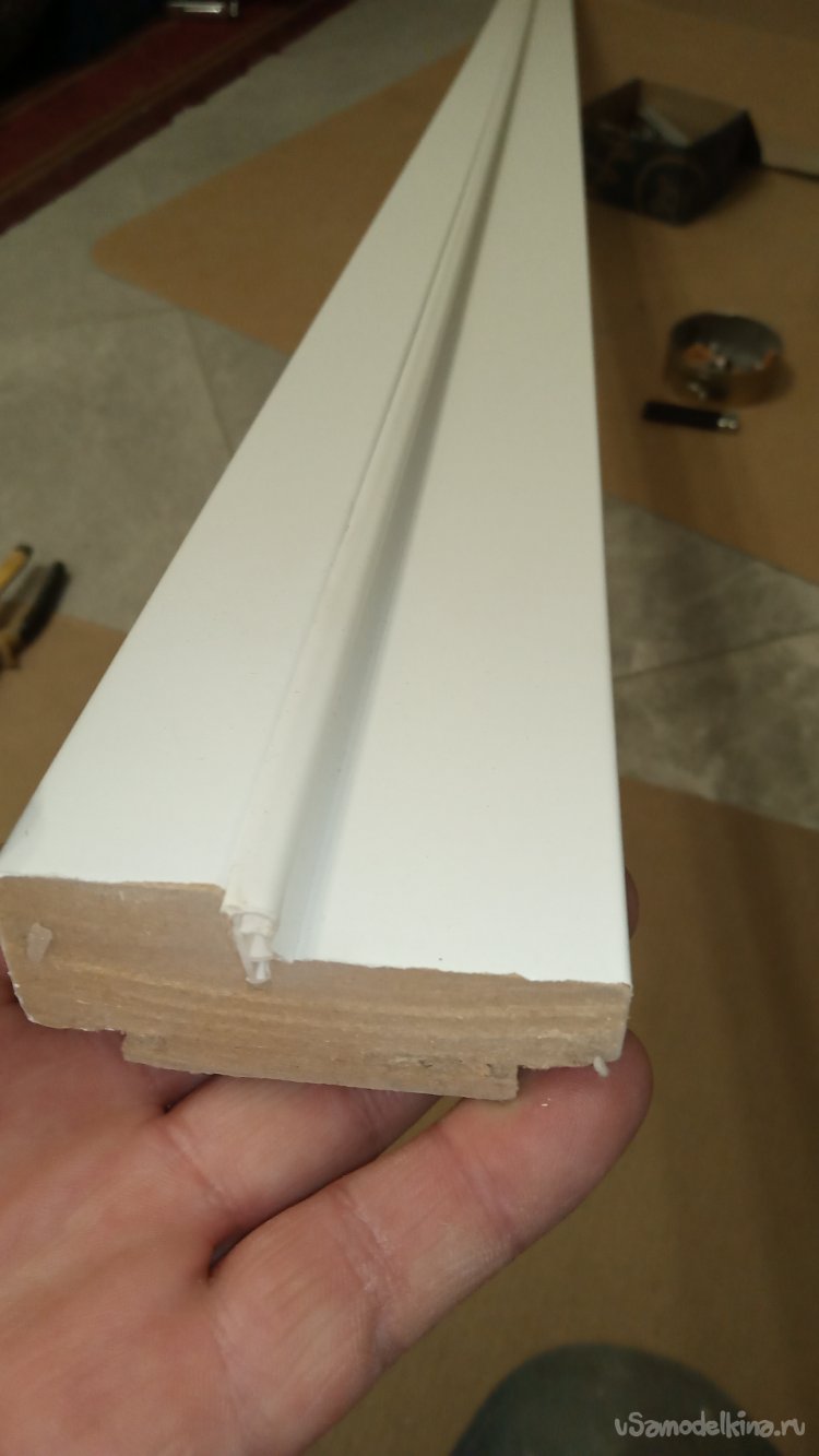 Потом закрепил уголки на наличнике, подложив под них проставки нужной толщины и смонтировал, вставив в паз в местах, где нет одного борта, и сдвинув на своё место.