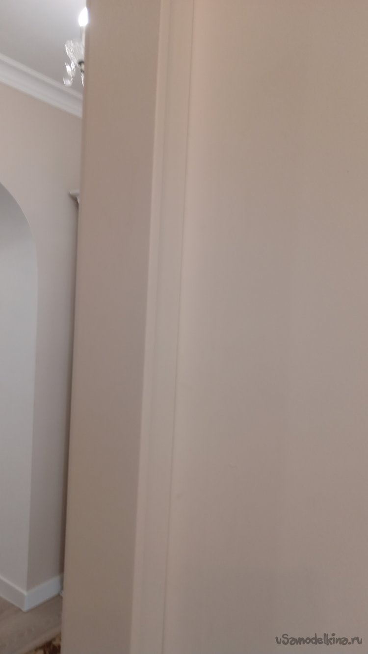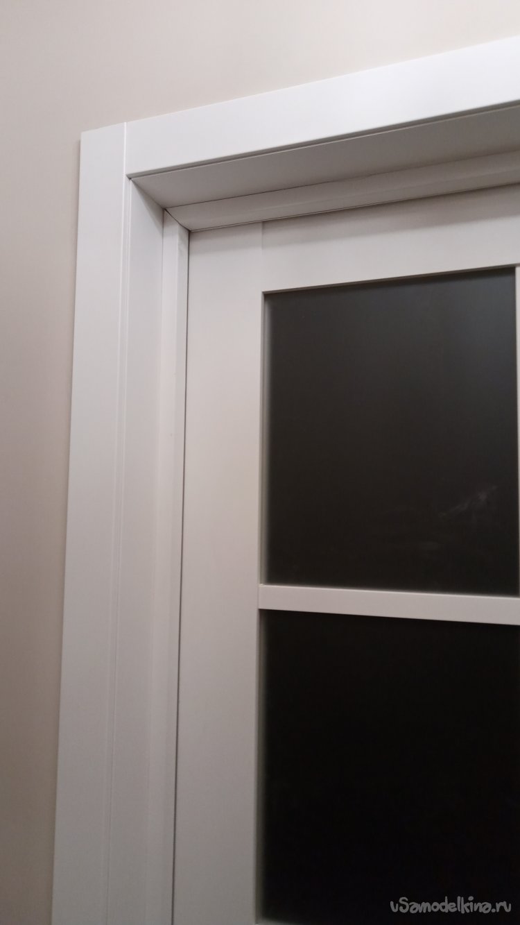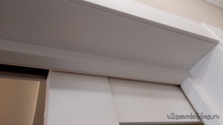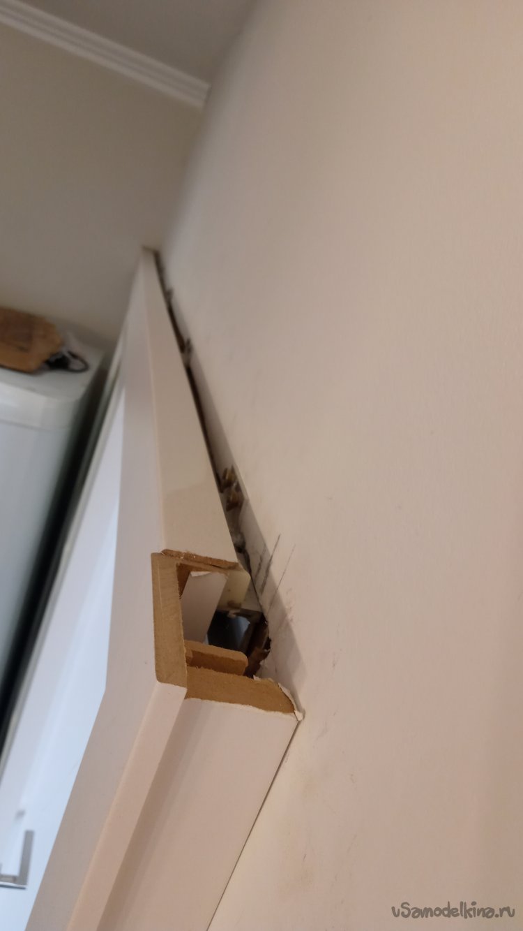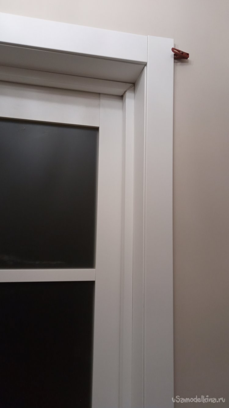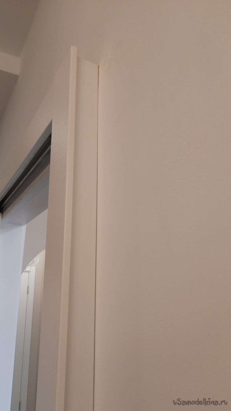 С внутренней верхний наличник у меня закреплён на рельсе, а боковой вертикальный просто штатно монтируется на выступающую внутрь коробку. (Он там один, так как с другой стороны коробку скрывает полотно двери в любом его положении). Из за того, что передняя коробка выступает за проём, между наличником и стеной есть зазор в тридцать миллиметров. В него я вклеил отрезанную часть коробки. И эстетичнее, и жёстче: