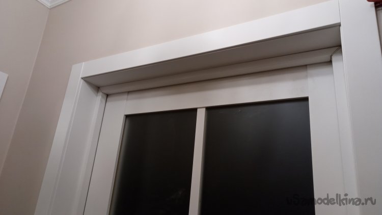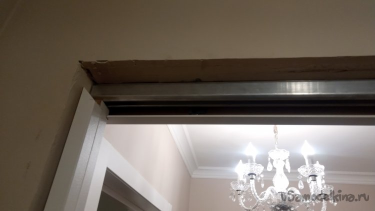 Как я уже говорил, я решил установить двери такого типа в двух местах - в тамбуре и на кухне. В тамбуре у меня не возникло никаких проблем с тем, чтобы потом замаскировать наличником верхний рельс, потому что,, зная, какая дверь там будет, я сделал перегородку с проёмом сразу "под неё". Т.е., верхняя часть стены, над дверью, у меня толще нижней на толщину полотна! И в качестве перемычки у меня заложен брус 50Х300 на ребро. К нему я и прикрепил рельс шурупами, просверлив в его "спине" отверстия. Дверь оказалась "утопленной в стену" и закреплённый сверху наличник полностью спрятал и верхний рельс и механизм: