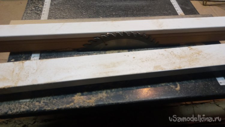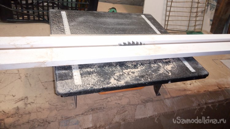 Остальные части коробки я распилил вдоль, предварительно достав из них уплотнительную резинку. По пазу, от нгеё и пилил. Это, кроме всего, ещё и позволило мне обойтись без сколов конечного покрытия. В качестве стационарной циркулярки прекрасно подошёл электрический плиткорез, который я купил, когда укладывал керамическую плитку. Просто сменил алмазный круг на круг по дереву.