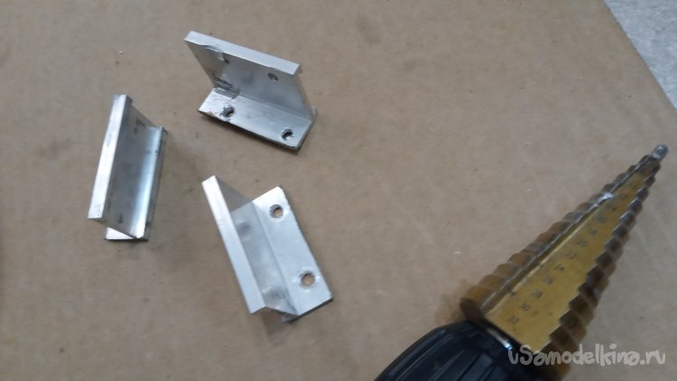 Монтажных тверстий в них нет. Подразумевается, что их нужно сверлить самому под свой крепёж. Стараясь сделать крепёж как можно более низким, чтобы потом спрятать его за наличником, я чуть обрезал уголки, просверлил в них отверстия и прикрутил шурупами помощнее из тех, что были в наличии. Потай решил не зенковать - всё равно это всё будет спрятано. А зенковка алюминия, достигающая самого края кронштейна, его ослабит. Как-бы не лопнул потом: