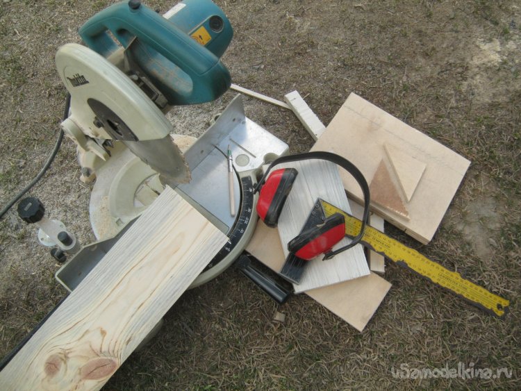 Фото 2. Размеченные простым карандашиком и столярным угольником деревяшки выпилил на торцевой маятниковой пиле – резы прямые и не длинные. Края деталей зашкурил от заусенцев средней крупности наждачкой.