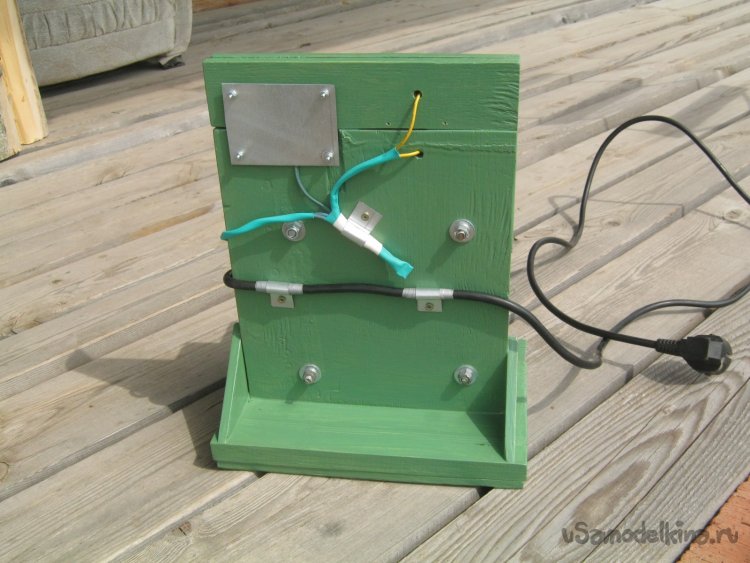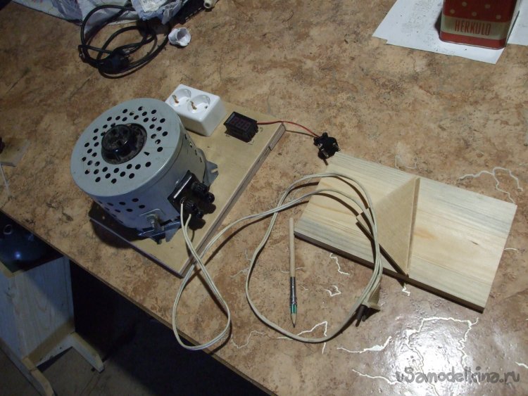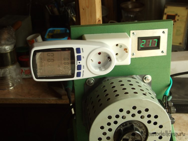 Кроме прочего, прибор не слишком удобен в эксплуатации – висящие провода, отсутствие табельного вольтметра. Порывшись в своих закромах нашел ему стандартную розетку и электронный вольтметр, хороший сетевой шнур. Во имя надежности и безопасности смонтировал все это добро на общем основании в виде этакого некрупного переносного стенда, где все провода механически закреплены не за места электрического соединения и риск «оператора» быть подключенным к осветительной сети много меньше.