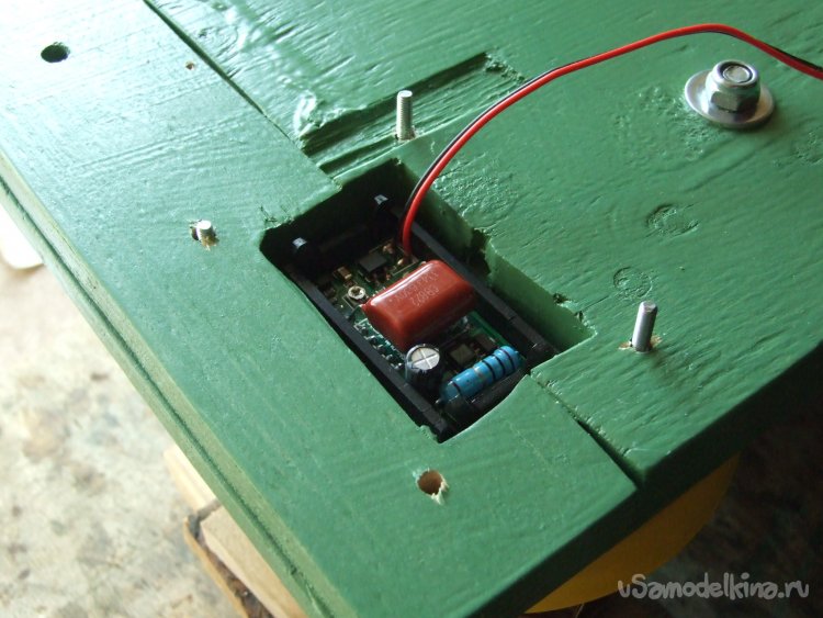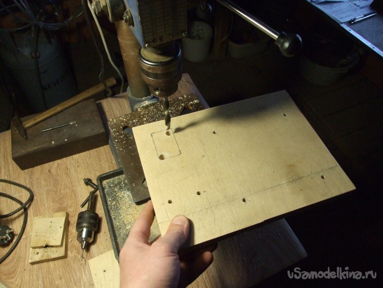 Фото 3. Поточнее разместил установочные элементы на основании и разметил места их крепления и проем для вольтметра, отверстия для проводов. На дощечке-подошве и косынках разметил и наколол шилом места тонких отверстий для гвоздиков.