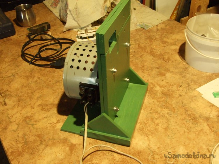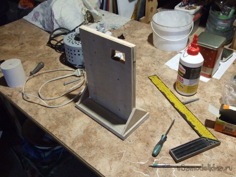Первым долгом в деревянном хламе подобрал основание – склеенный, в два 10 мм слоя, кусок фанеры и скомпоновал на нем установочные элементы. Рабочее положение основания принял вертикальным, так компактнее и лучше видно со стороны. Опять же, напоминает характерные ретро-лабораторные приборы для демонстраций и опытов. Подошва-подставка из куска нетолстой строганной сосновой доски и пара косынок-треугольников для прочности.
