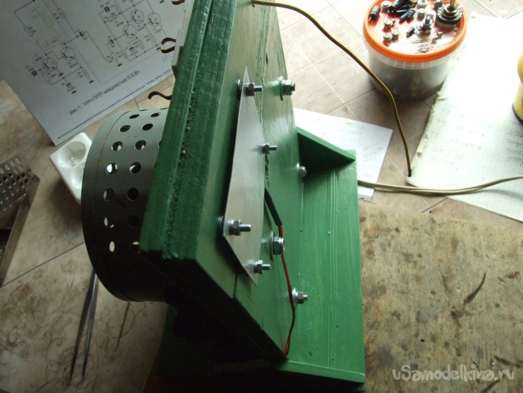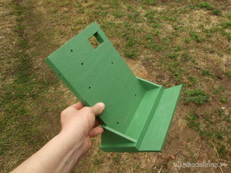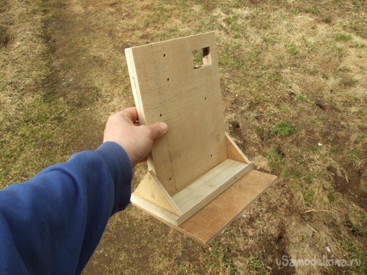 Фото 6. Первая же примерка ЛАТРА выявила недочет – прибор массивный и довольно высокий образует центр тяжести конструкции смещенный вперед. Стенд с установленным ЛАТРом не опрокидывается но на такую возможность таки намекает. Пришлось подошву несколько расширить вперед. Разбивать склеенное решительно не хотелось, а сострогать мешали гвозди. Пришлось поступить вульгарно – вырезал и приклеил-приколотил дополнительную пластинку из нетонкой фанеры. Некрасивую ступеньку в готовой конструкции отчасти маскирует ЛАТР.