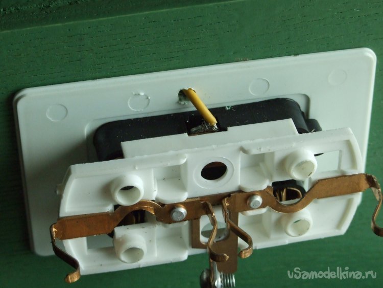 Фото 9. Установил на свое место блок розеток. Для выводов на обратную сторону панели заранее разметил и просверлил в деревяшке пару отверстий около клемм. После установки розетки, просверлил ее пластиковое основание через эти отверстия сзади. Зачистил концы проводов от изоляции, скрутил жилы и сформовав по петле подключил их к винтовым клеммам розетки. Пришлось повозиться и применить пинцет с тонкими губками.