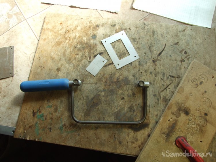 Фото 10. Для установки цифрового вольтметра пришлось сделать две дополнительные детали из тонкого металла. Применил оцинкованную сталь 0,5 мм. Подобрал подходящий кусочек, разметил по месту наружные размеры и места крепления, вырезал ножницами по металлу, тюкнул центры будущих отверстий керном и просверлил. Разметил окно для установки вольтметра и выпилил его ювелирным лобзиком. По готовой лицевой детали как по шаблону сделал заднюю крышку.