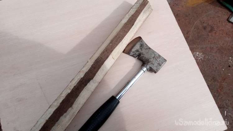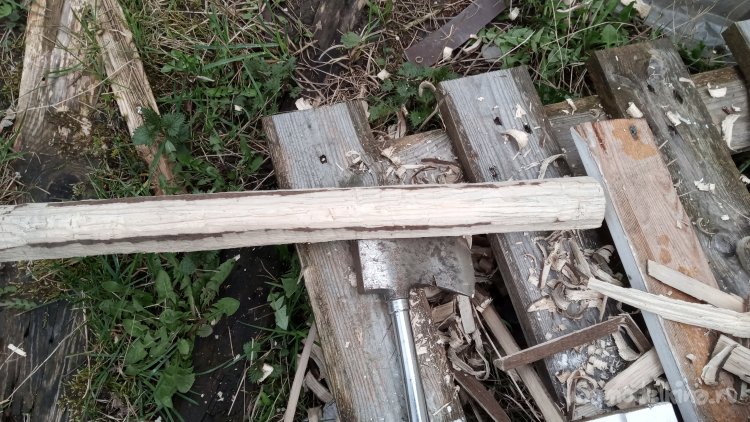 Взял его, решил обтесать. Идти в сарай за инструментом не хотелось.))) Взял в машине топорик, который в ней ездит и обтесал грубо:
