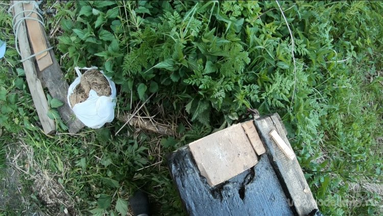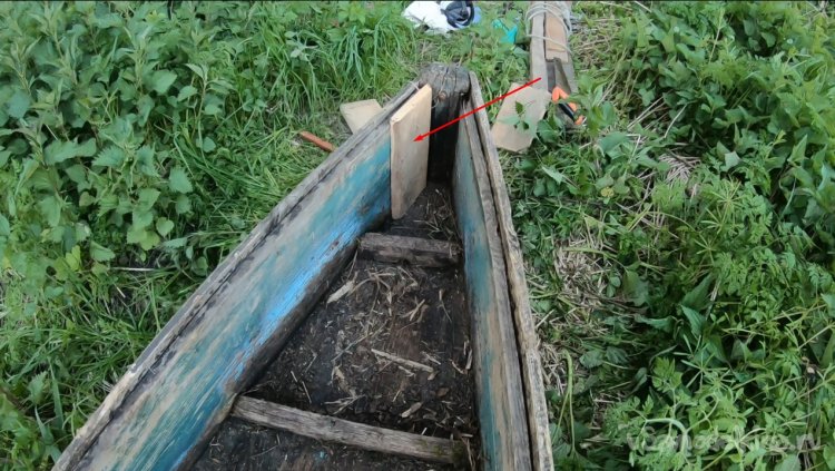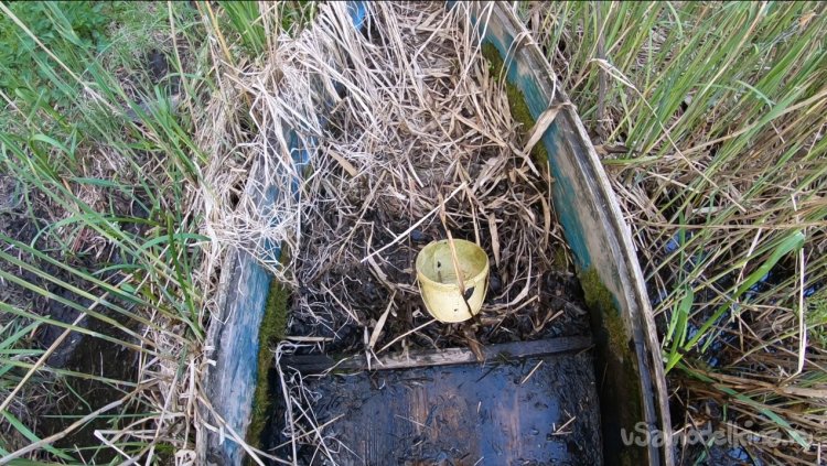 Лодка была затоплена водой, хорошо, что она была не в воде, а то потонула бы как предыдущая. Немного поработал ковшиком и откачал воду. Также выкинул с лодки мусор. В задней части обнаружились дырки, вода бьет фонтанчиком, время сделало свое дело.