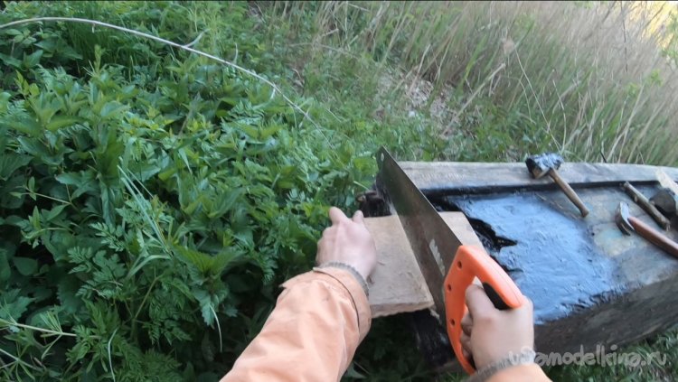 Далее я подобрал доску для носовой части и прибил ее изнутри внахлест. Доска понадобилась широкая, чтобы подальше зайти на неповрежденную доску лодки.