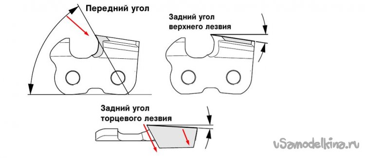 6. Важно понять для себя два угла на зубе, один угол на фото "передний", он решает то, как хорошо зуб цепляет древесину. Зуб можно наточить под более острым углом для мягких пород, и под более тупым для твердых. В среднем этот угол должен быть 45 градусов на глаз.