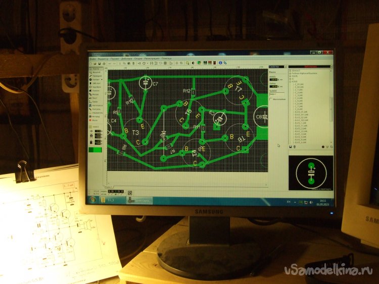 При проектировании такой платы обычному квадратно-гнездовому размещению элементов предпочитаем ортопедический, свободный, печатные соединения кратчайшие - от точки к точке. Двухвыводным SMD элементам не выделяем нарочитые места, но вставляем их в разрыв соответствующих дорожек (Фото 1, 2). При этом положение этих элементов на ПП вполне узнаваемо без всяких дополнительных мер. При ручном нанесении рисунка дорожек, выполняем их непрерывно, не учитывая SMD компоненты. Их места определяем и делаем при ретушировании – небольшие разрывы в нужных местах дорожек без труда процарапываются шилом или крупной иглой.