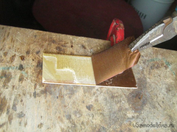 Фото 4. Моя заготовка с двухсторонним фольгированием и верхний слой не нужен. Будущий прибор низкой частоты, дополнительный экран ему тоже ни к чему. Чтобы не тратить травильный раствор и не предпринимать специальных мер по защите от него, один из медных слоев удалил – подогрел его строительным феном на второй передаче и подковырнув уголок фольги лезвием, снял пинцетом или некрупными плоскогубцами. Размягченный эпоксидный клей отрывается хорошо.