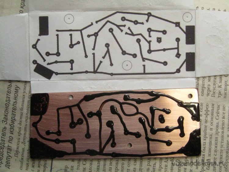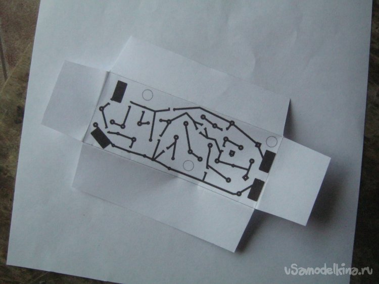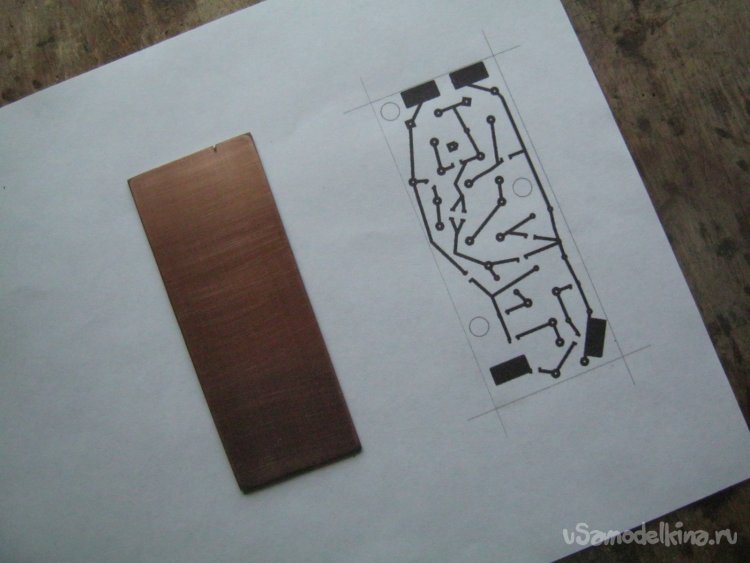 Фото 5. Рабочую поверхность старой окисленной фольги тщательно зачистил несколькими номерами некрупной наждачки. Вдоль и поперек. Распечатал бумажный рисунок токопроводящих дорожек в масштабе 1:1.