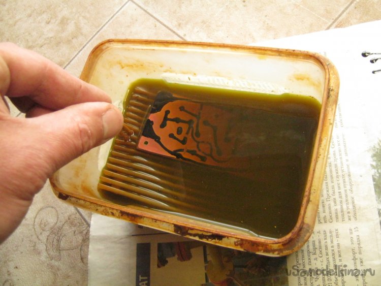Фото 14. Готовый рисунок вытравил обычным хлорным железом. Его рабочий раствор держу в герметично закрывающемся пластиковом судочке для бутербродов и некрупные платки можно обрабатывать прямо в нем. Заготовку окунал на полиэтиленовой решеточке с ручкой – кусочке сборника прополиса для пчеловодства. Подогрев импровизированной кюветы и периодическое ее покачивание для удаления продуктов реакции не заставили ждать долго.