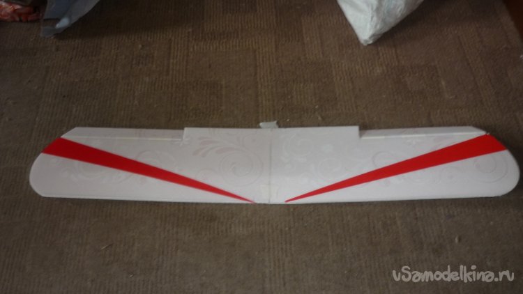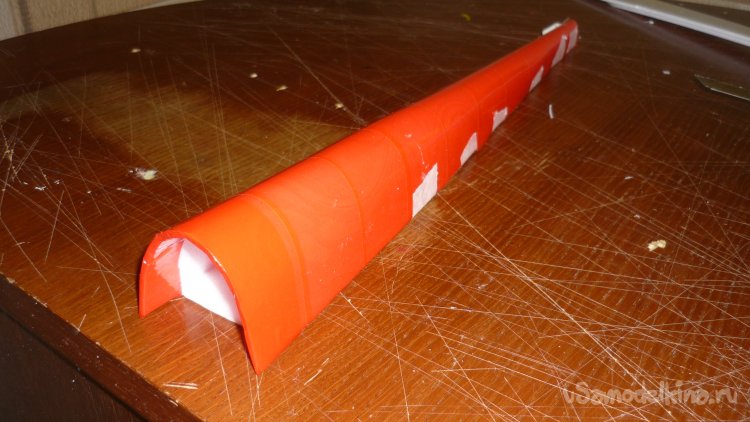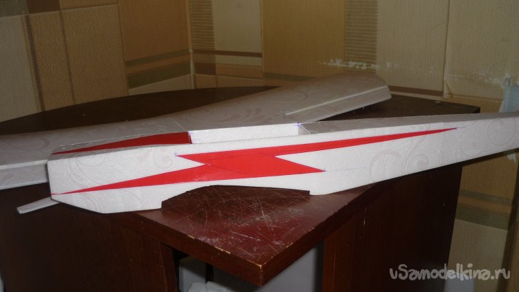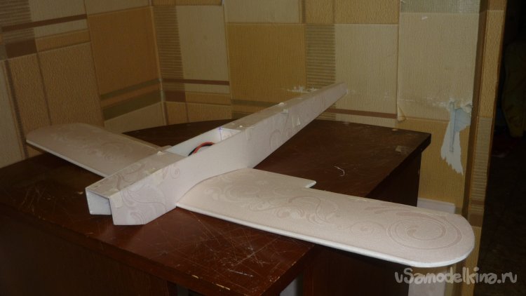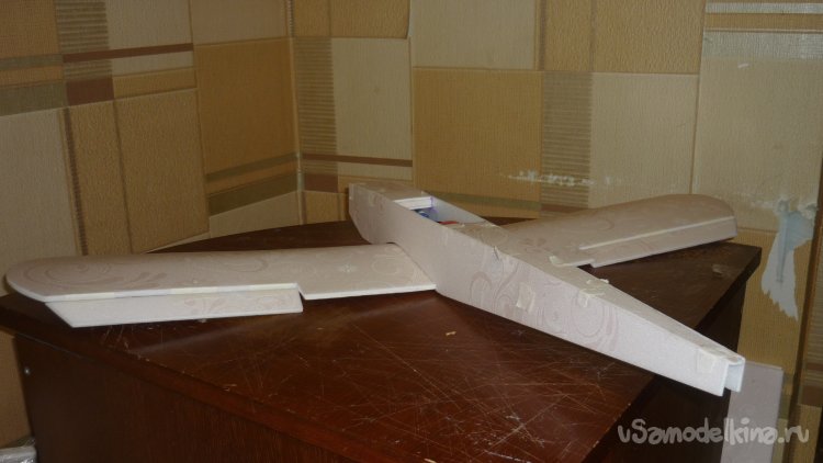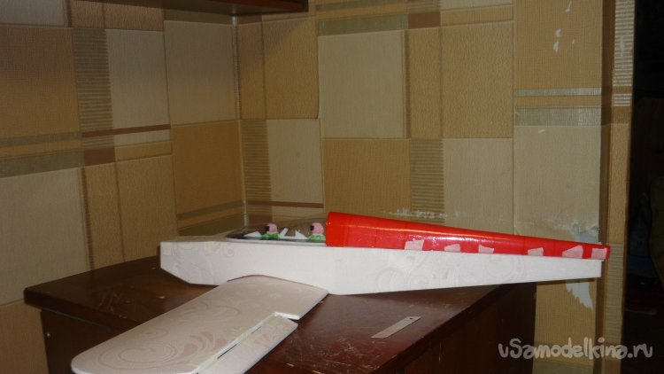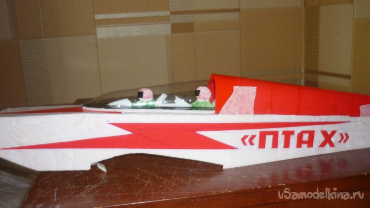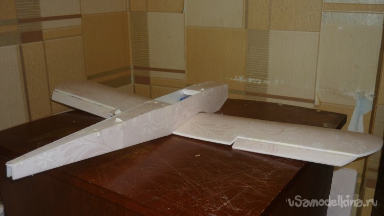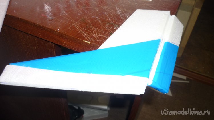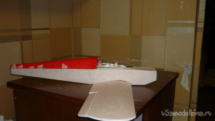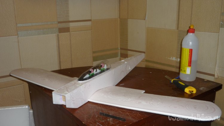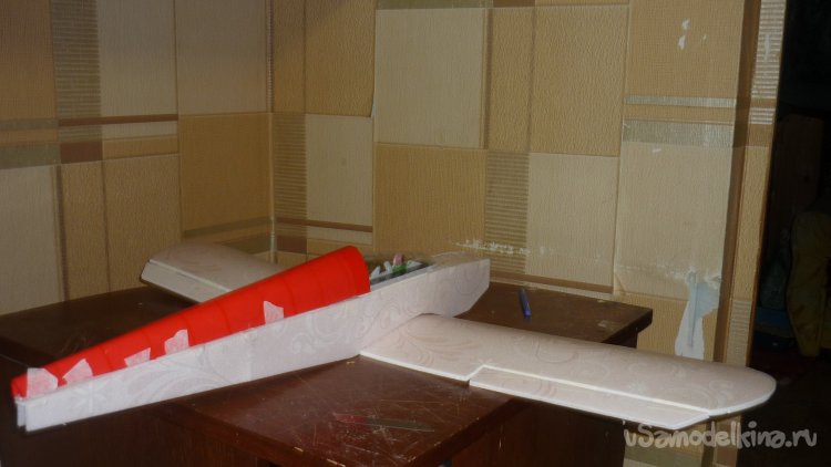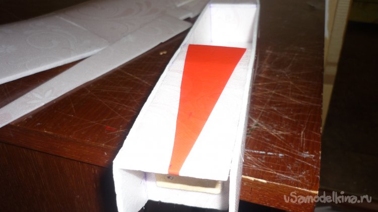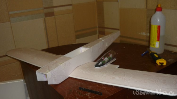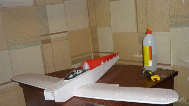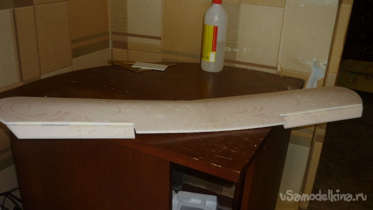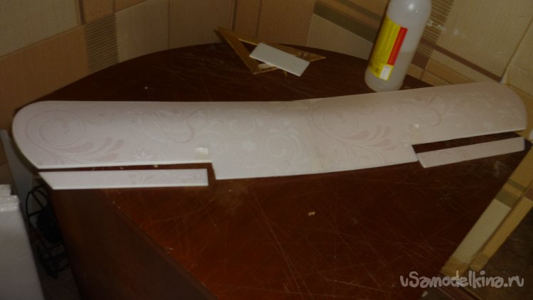 На верхней поверхности внешней обшивки у крыльев, приклеил полосу потолочки, что бы избежать смещения вбок, при установке.
