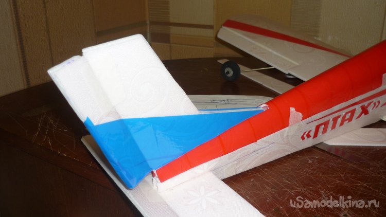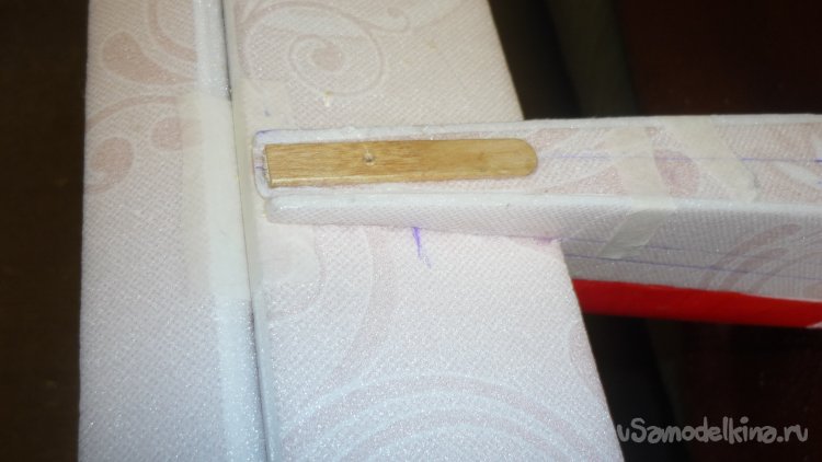 Крылья сделаны съёмные и будут крепиться резинками, для этого в фюзеляж вклеены половинки деревянных зубочисток.