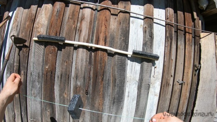 К палке можно прикрутить поплавки, я переборщил с их размером, и потом их пришлось снять. Также по центру равновесия привязываем веревку и к ней тоже крепим поплавок. Кстати, если веревку потом отрегулировать по глубине, то он будет дергаться при попадании рыбы в экран.